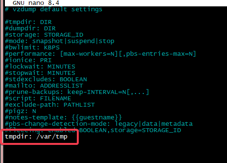 I nano’ed my happy ass over to vzdump.conf and added this to the file and saved it.
