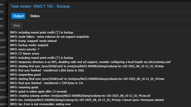 But then I noticed some of my container backups would fail with permission issues. PBS was fine, even local backups were no problem. I checked and rechecked NFS, changed permissions changed NFS mappings, etc.