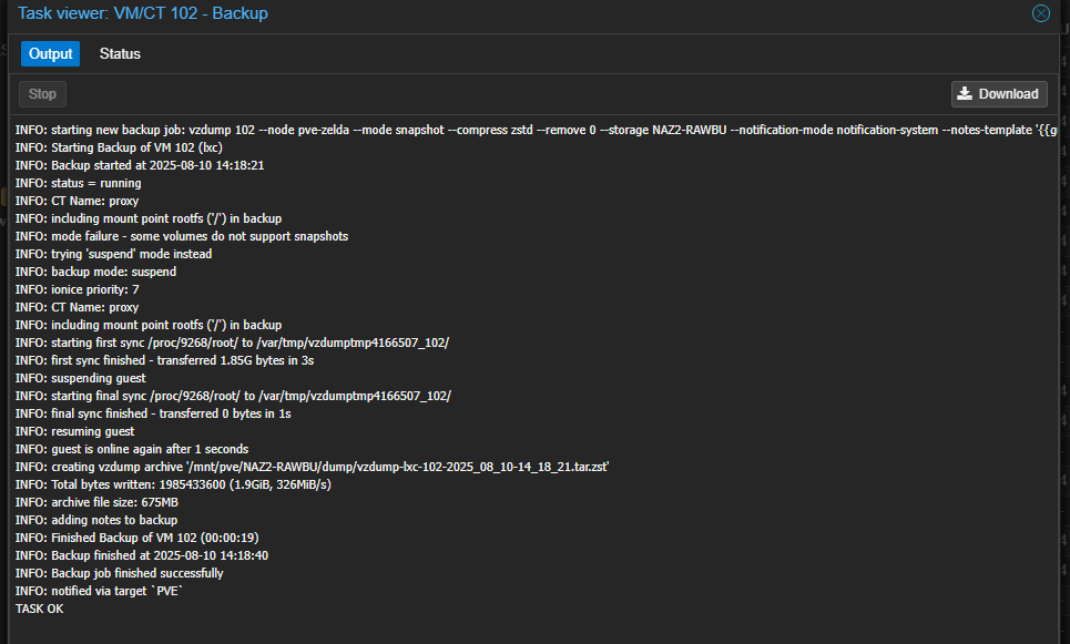 I ran the backup again, and not only did it finish, it finished faster than ever since it didn’t have to transfer all the small files contained in the LXC over to the NFS share first. Just the finished archive.