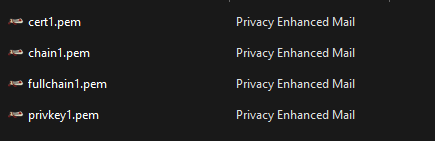 Typically you’ll use the cert.pem and the privkey.pem. PEM is an open standard, if you change the extension to .crt in Windows you’ll open it in cert manager. About the privkey…