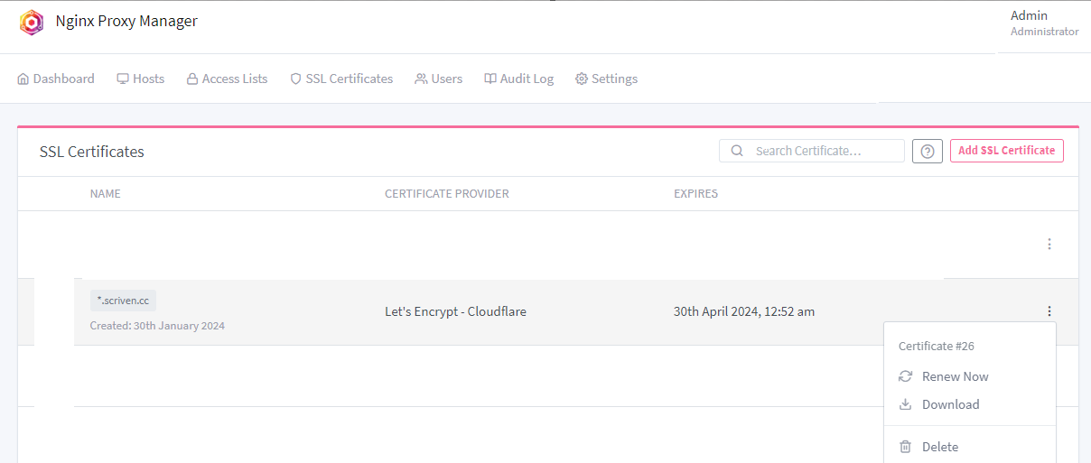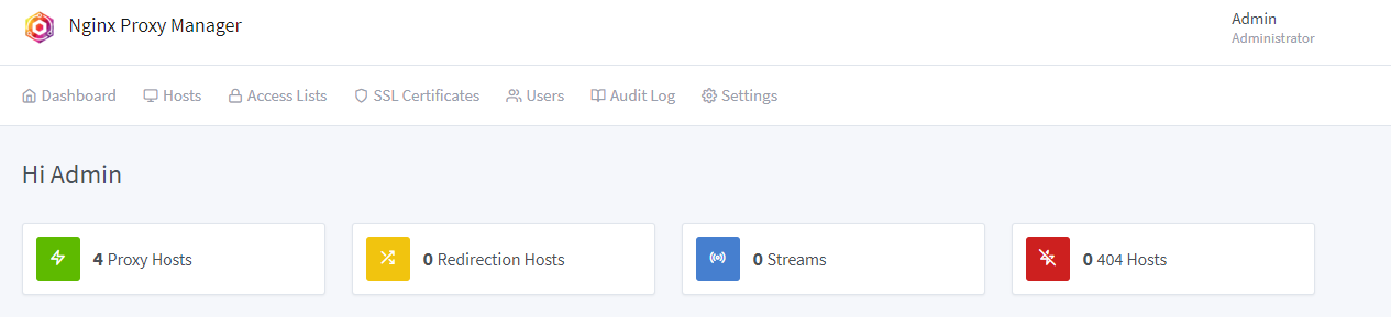 Once up running, logging in is pretty uneventful. It’s a basic tool for a basic use. I have 4 proxy hosts on mine, with several certs.