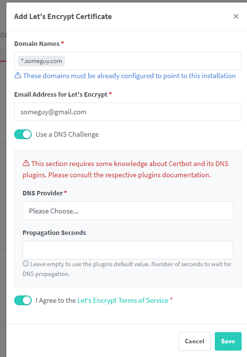 You’ll notice right away you can pick LE or “Custom”. Custom is if you want to use any cert you have and apply it to a proxy host. Super useful! Once you click the LE button, you’re presented with the setup process. Right away you’ll notice the challenge, email address, TOS, just like our command from earlier.