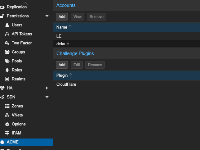 Under datacenter, go to Acme and set up the account and challenge. Lots of options here, including Cloudflare. Once configured (the documentation is great here) then go the server>certificates and order the cert. The process is near identical for PBS.