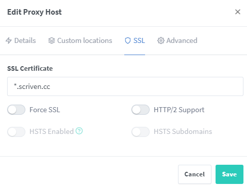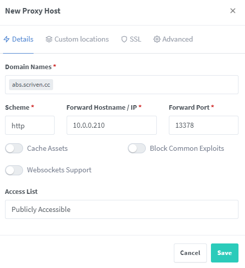 Lets set up a proxy host! I have a podcast server, Audio Bookshelf. I want it to be TLS encrypted for access and obfuscate the port it runs on. Perfect use case for a proxy. I will use my scriven.cc domain for this.