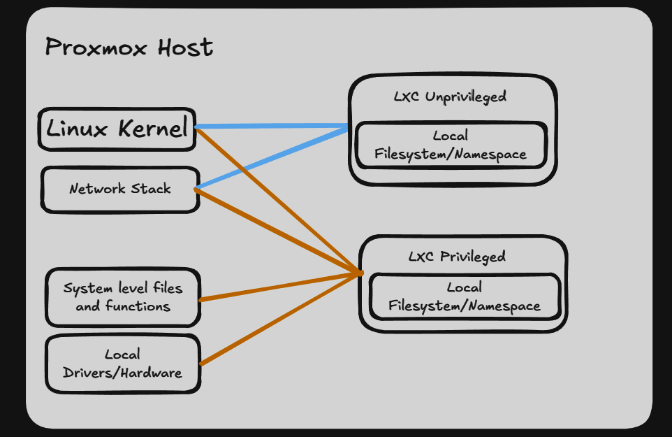 Contrary to the header here let’s talk about what an LXC is. It’s container based virtualization, but it’s tied tightly the host OS. It does have its own file system but it shares the local kernel, etc. By default, it is “unprivileged” which limits its blast radius, but it can also be set to “privileged” which grants it even deeper access to the host. (arguably dangerous) Regardless of the Linux Distribution the host is on, you can make a LXC with just about any other Linux Distribution due the the nature of the shared Linux kernel. Because of this, LXC’s start extremely quickly as they're not booting their own kernel or initializing their own hardware drivers.