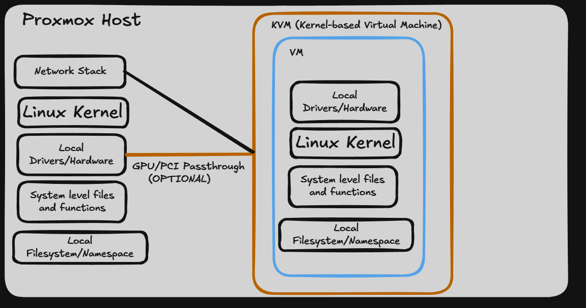 The network stack is edited in the VM, etc. If you need to, you can also “passthrough” physical devices to a VM like a GPU. It takes much longer to boot than LXC, but can be “live migrated” to another host as it does not rely on local resources.
