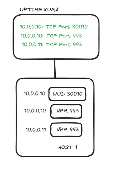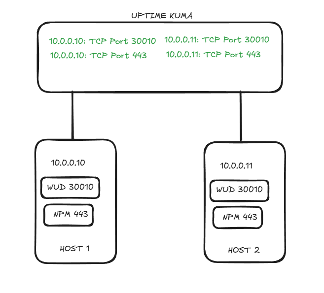 So at 10.0.0.10 I have WUD on port 30010 and NPM (Nginx Proxy Manager) on port 443. I have the same setup on 10.0.0.11. My eye in the sky, Uptime Kuma keeps tabs on everybody for downtime notifications.