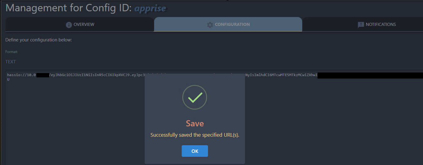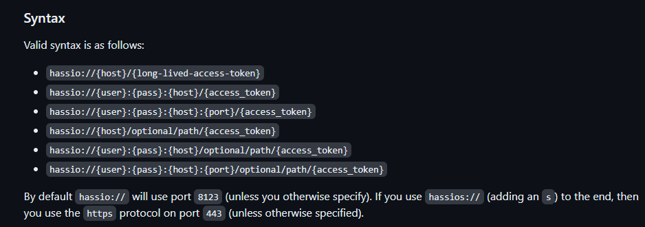 Then open a new window for the “Notification Services” page which will list the variables for all the supported destinations. for HA I am going to use the top one, hassio://{host}/{long-lived-access-token}