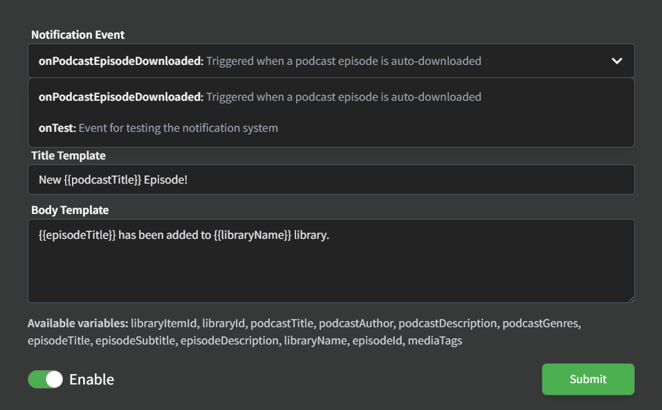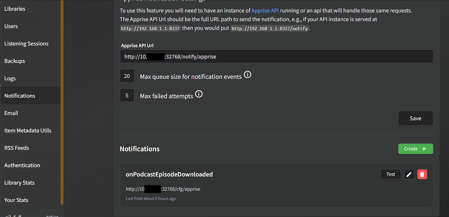 One of the things that were missing though, were notifications for new podcast episodes. Going through the settings, I saw that a requirement for this was an “Apprise” server.