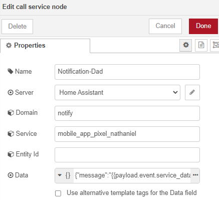 Excellent! We’re almost done. Let’s make the notification a push to a device with Node-Red. I’m not going to get terribly in the weeds with NR here, see this post for a more detailed breakdown.