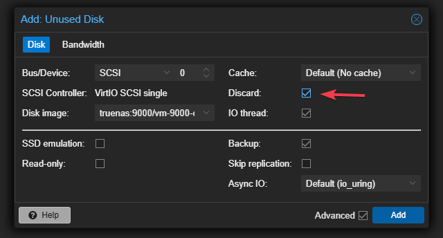 Check “discard” and add the disk. And yes, I know the disk is small. Don’t extend it yet.
