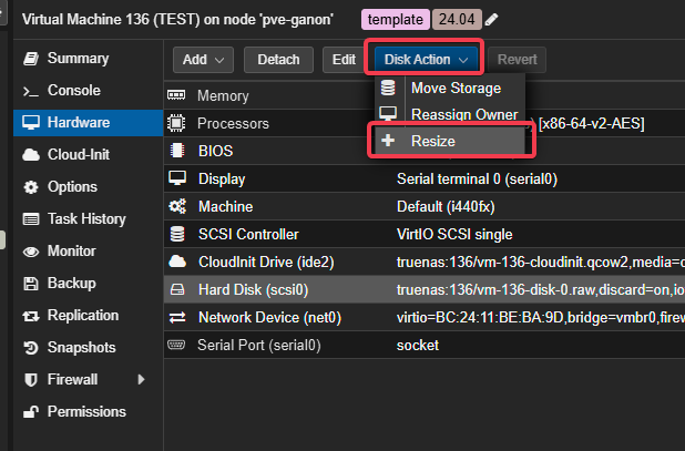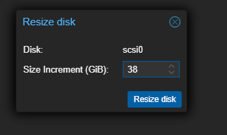 Let’s delete the VM and recreate, but don’t start it. On scsi0, let’s resize.