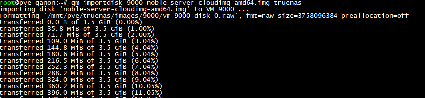 E.G.: qm importdisk 9000 noble-server-cloudimg-amd64.img truenas