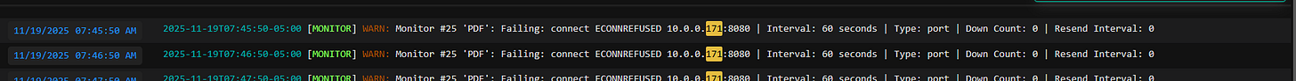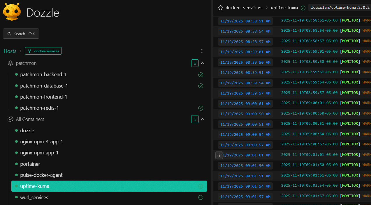 Not much more to say, apart from finding a solution that meets another need I had. Pulse for detailed host usage/alerts, Kuma for easy uptime alerts, and now Dozzle for easy consumption of container logs! I think the only thing now missing is some way to gather all the patch information in one place about all my Linux hosts.